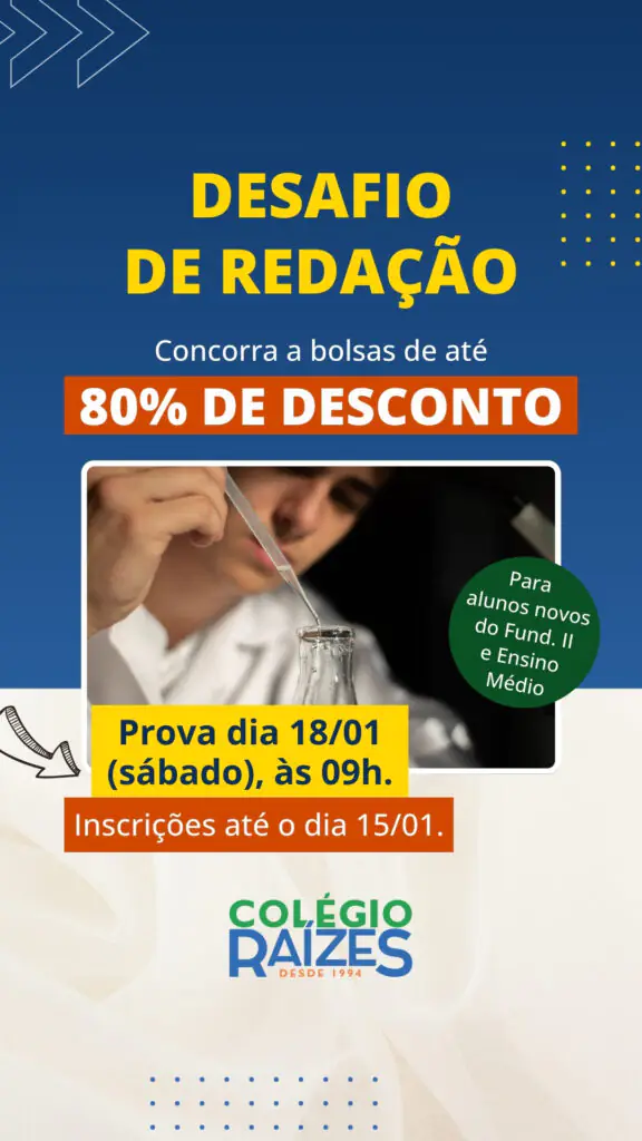 O Desafio Raízes oferece até 80% de desconto nas mensalidades escolares. Inscrições abertas no www.colegioraizes.com.br. A prova será no dia 18 de janeiro de 2025, às 9h, na sede do Raízes, Estrada Cruz do Século, s/n, Jardim Maricá. Ligue 4790 4332 e 11 913056837.