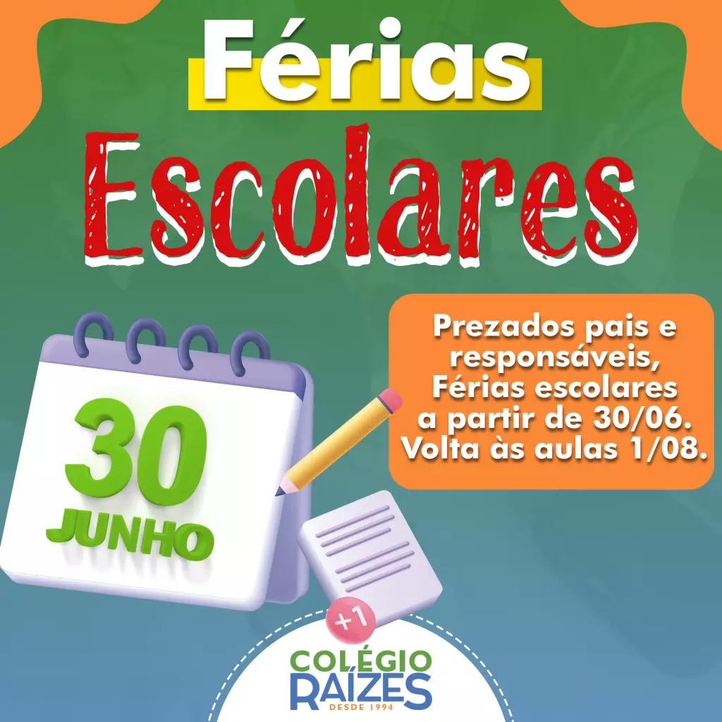 Férias Escolares Colégio Raízes 3 anos atrás Prezados pais e responsáveis, Férias escolares a partir de 30/06. Volta às aulas 1/8.
