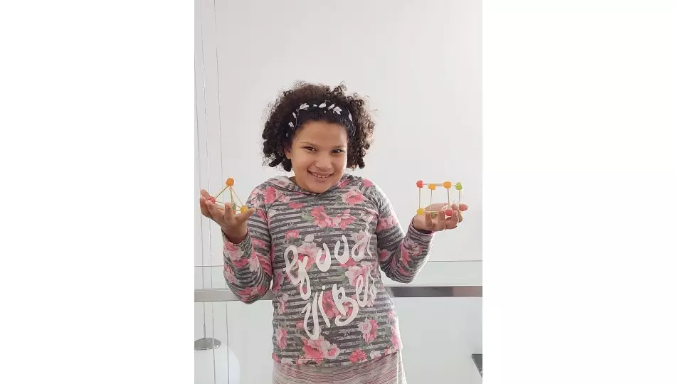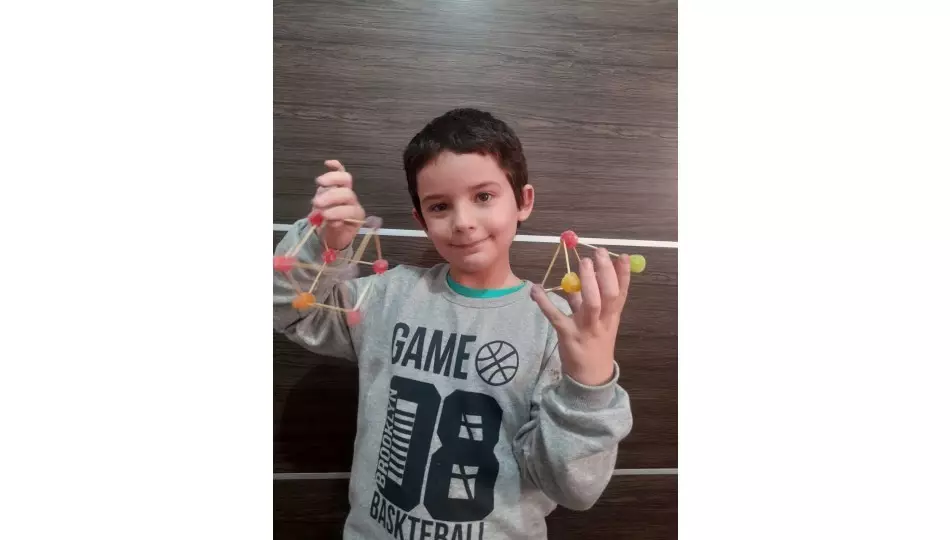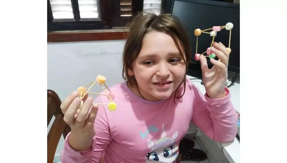 Os alunos confeccionaram uma pirâmide e cubo com palitos de dente e balas de goma, com a intenção de identificar as arestas e os vértices destes. Estabeleceram assim uma relação de semelhanças e diferenças.